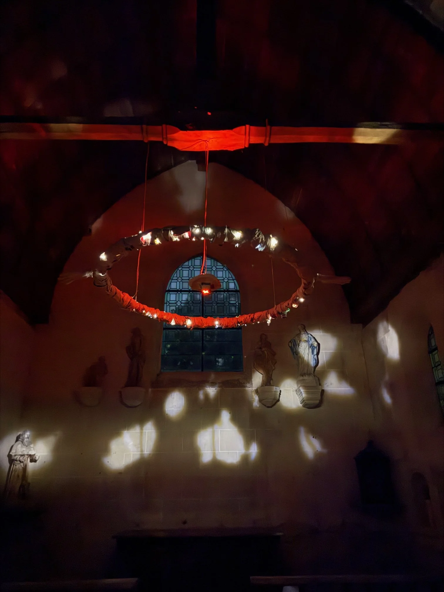 Gratiae habitio (merci merci merci). Installation (2025) dans une chapelle (1733) dédiée au saint thaumaturge Saint Roch (1343), située en Anjou, France. En remerciement à son intercession, les ex voto prenaient simplement la forme de vêtements déposés aux pieds de l’autel. Ce n’est que tardivement que des plaques de marbres gravées furent ajoutées. L’installation reprend les vêtements usés comme matériau support de bandages plâtrés. la croix rouge, elle, témoigne d’une filiation du soin, des ordres hospitaliers aux ONGs laïques.